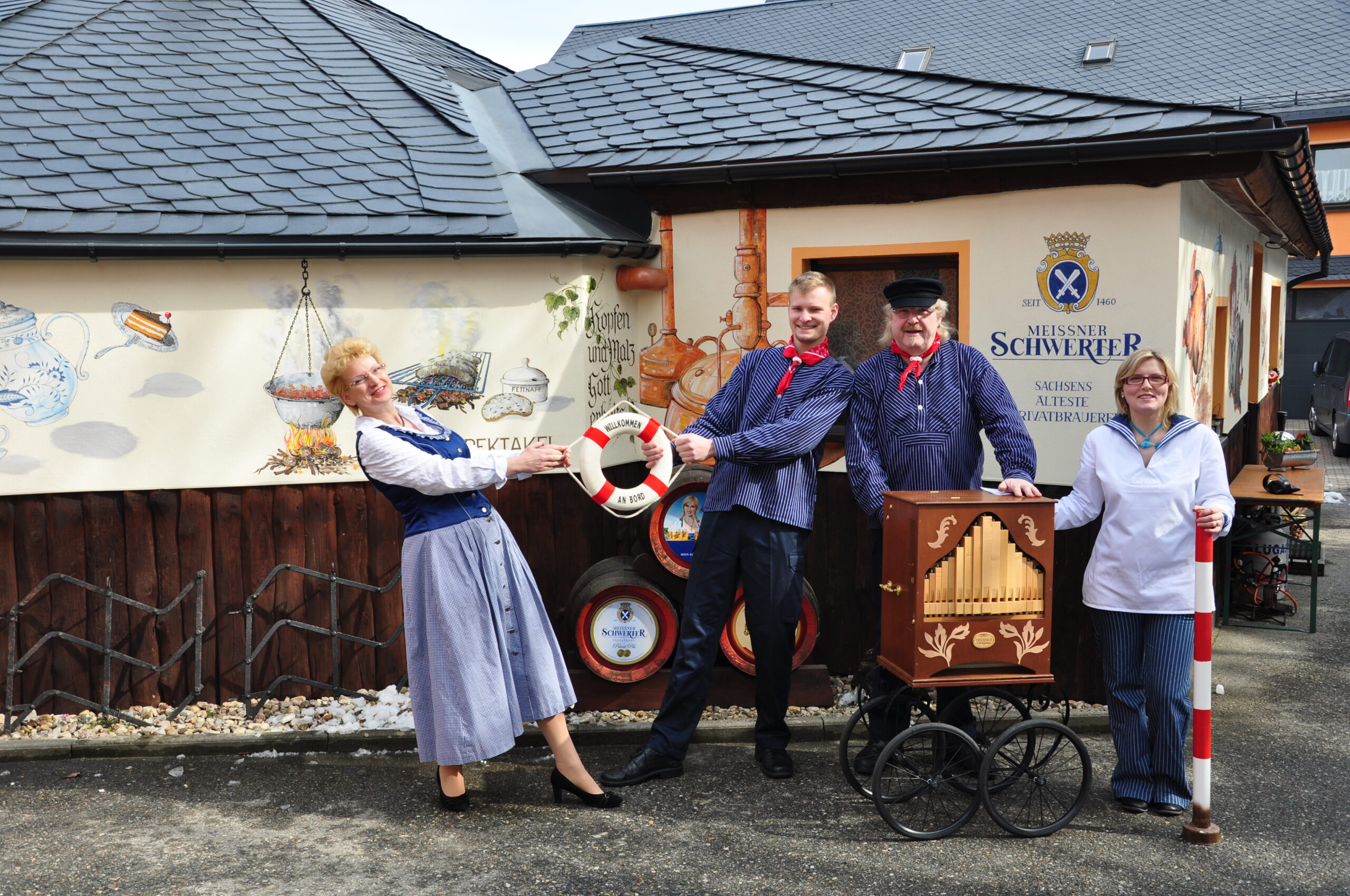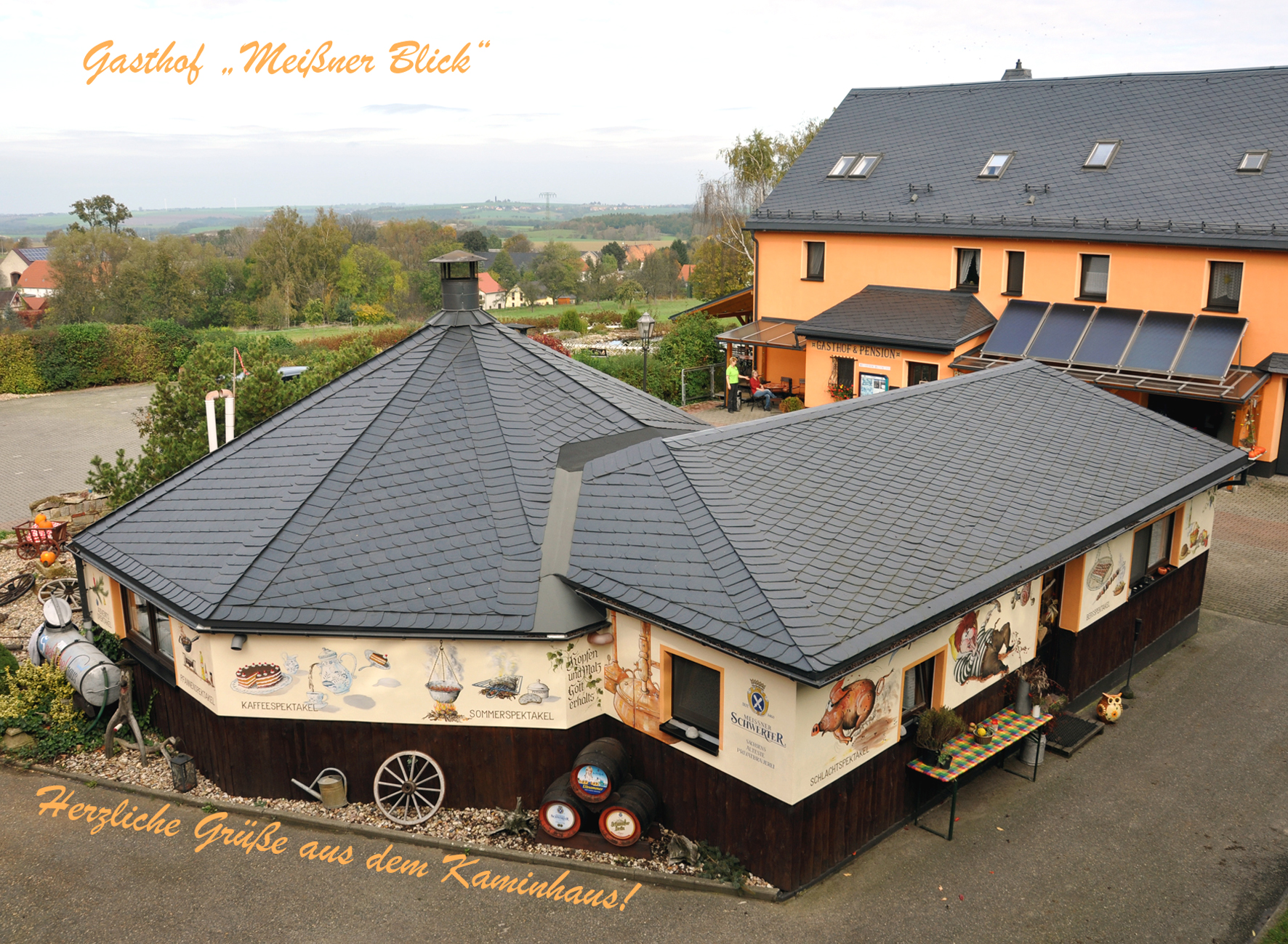 Auf unserer Terrasse am idyllischen Teich erwartet Sie außerdem ein faszinierender Rundblick übers Land. Wir sind eng verbunden mit der regionalen „Privatbrauerei Schwerter Meißen“ und bieten Ihnen auch Weine aus dem „Weinanbaugebiet Meißen“ an. In der Spektakelhütte finden verschiedene, thematische Spektakel statt. Ganz gleich, welches Sie ausgewählt haben, es wird immer urig gemütlich! Dafür sorgen mit Schwung und guter Laune Familie Kießling mit dem Spektakelgefolge.